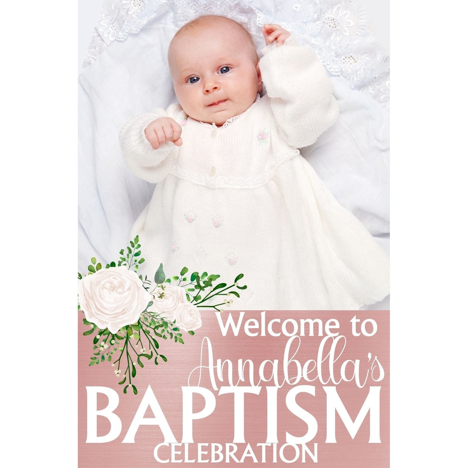 Welcome your guests in style with our Customizable Yard Sign / Lawn Sign Welcome Baptism Pink Backdrop Floral with Photo. This beautifully crafted 16"x24" rigid coroplast sign features an elegant pink floral backdrop, making it the perfect touch for your baptism celebration.