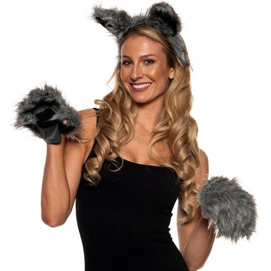 Unleash your inner beast this Halloween with our Werewolf Headband With Attached Ears and Fingerless Gloves w/Faux Fur. The headband features plush, realistic ears perched atop a comfortable band, while the fingerless gloves offer effortless dexterity with soft faux fur accents.