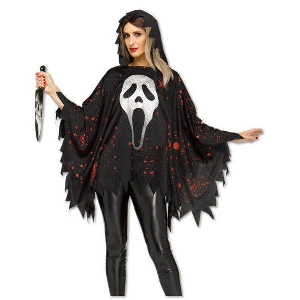 Unleash your inner horror fan with the Poncho - Adult Ghost Face Scream Stalker. This stylish and eerie poncho captures the essence of the iconic Ghost Face character, making it the perfect addition to your Halloween costume or horror-themed event. Crafted for both comfort and chilling aesthetics, it features a lightweight design that allows for easy movement while providing ample coverage.