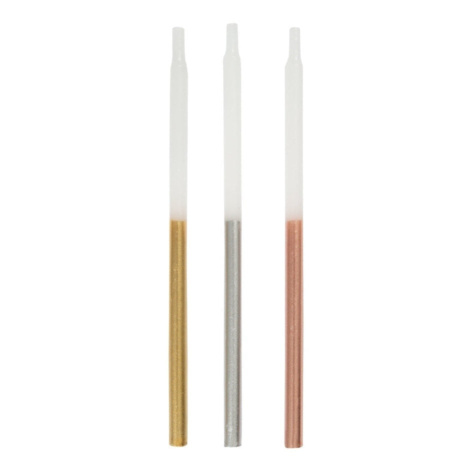 Make your next celebration unforgettable with these eye-catching metallic dipped candles. Order your Candles - Metallic Dipped Birthday 5" - Assorted, 12 Count today and get ready to light up the party!