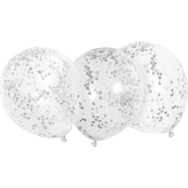 Perfect for any occasion, elevate your festivities today with our Clear Latex Balloons with Silver Confetti 12", 6 Count and let your events sparkle with joy!