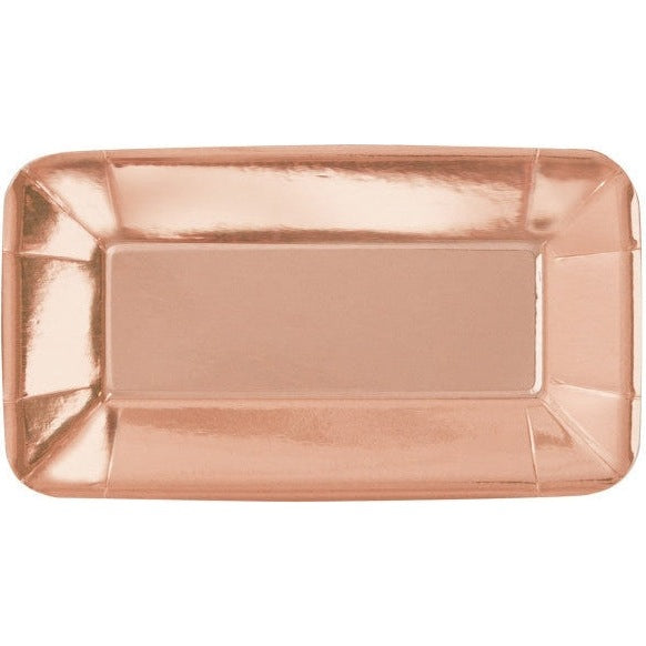 Whether you're hosting an elegant dinner party, a casual get-together, or a festive celebration, these Rose Gold Foil Rectangular 9" x 5" Appetizer Plates will impress your guests. With eight plates in a pack, you’ll have plenty for your gathering.