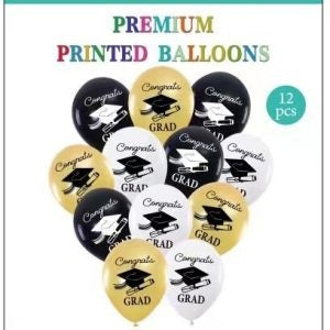 Don’t wait to celebrate! Order your 12 Congrats Grad White, Black & Gold Balloons today and let the festivities begin!
