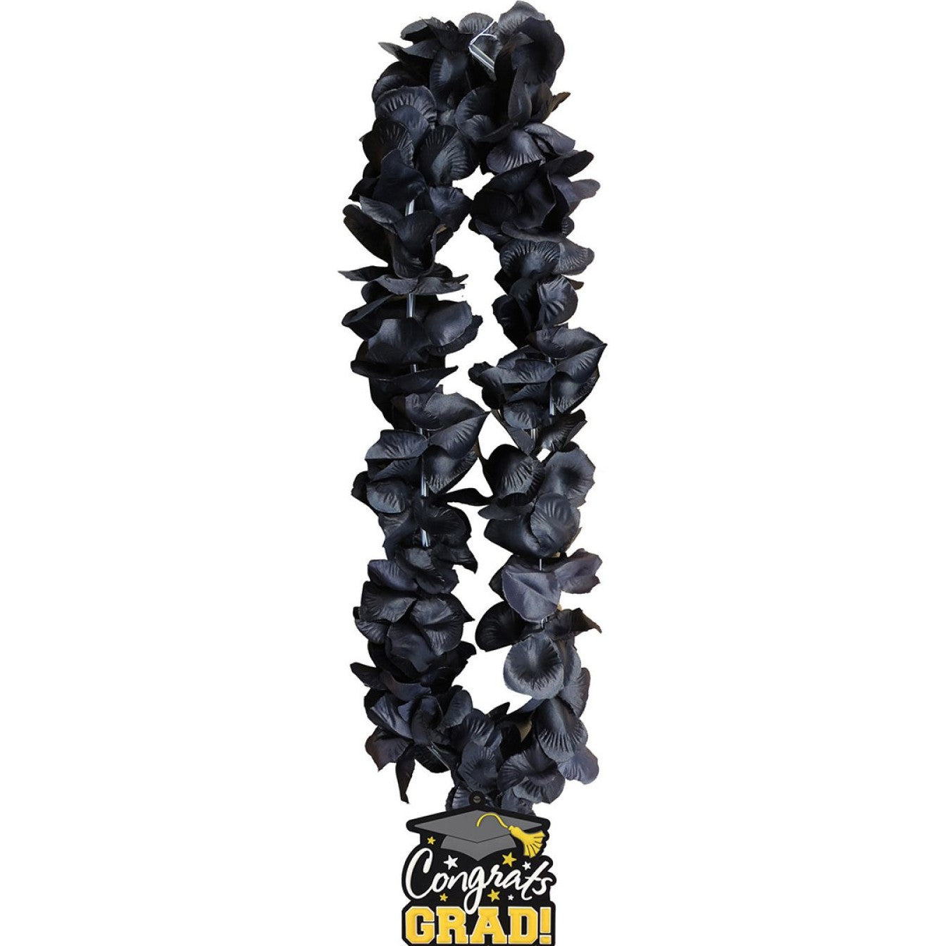 Celebrate your academic achievements in style with the 48" Congrats Grad Black Hawaiian Lei. This stunning lei features vibrant black hues that beautifully complement your graduation cap and gown, making it the perfect accessory for your special day.