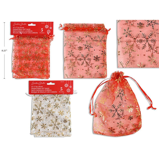 Wrap your holiday gifts with festive flair using our 5 Pack Christmas Foil Snowflakes Organza Drawstring Bags in red and white. These shimmering, translucent bags showcase delicate foil snowflakes, adding elegance to every present while keeping contents secure.