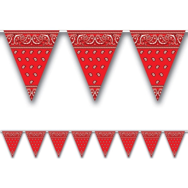 Add a splash of color and style to your next event with our Bandana Pennant Banner Red; All-weather; 12 Pennants/string. Designed to withstand the elements, this vibrant banner is perfect for both indoor and outdoor use. Each string features twelve beautifully crafted pennants that evoke a festive, western vibe, making it an ideal decoration for parties, barbecues, and celebrations.