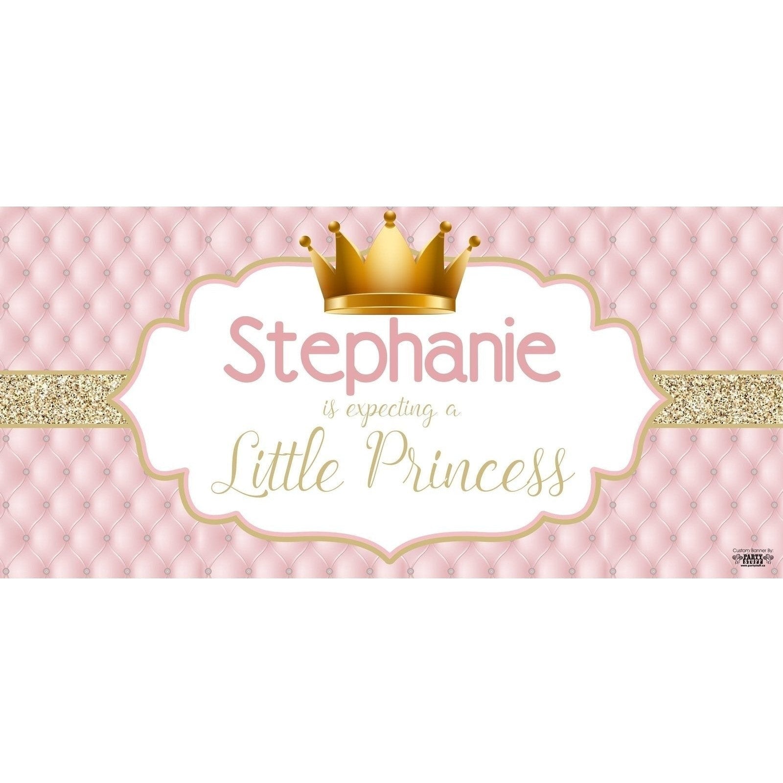 Transform your baby shower celebration with our Banner - Custom Deluxe Baby Shower Pink & Gold Crown. This exquisite banner is designed to enhance your event’s atmosphere, making it memorable for you and your guests. Crafted from durable vinyl, it measures an impressive 5' wide by 30" tall, ensuring your special message stands out beautifully.