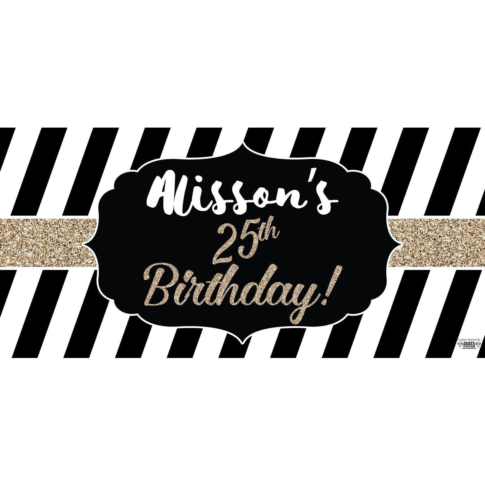 Elevate your celebration with our Banner - Custom Deluxe Birthday B&w Stripes & Gold Sparkles. This stunning banner is designed specifically to make your special day memorable. Measuring an impressive 5 feet wide by 30 inches tall, it is crafted from durable vinyl that ensures vibrant colors and long-lasting use. The elegant black and white stripes combined with sparkling gold accents create a chic backdrop that perfectly complements any birthday theme.