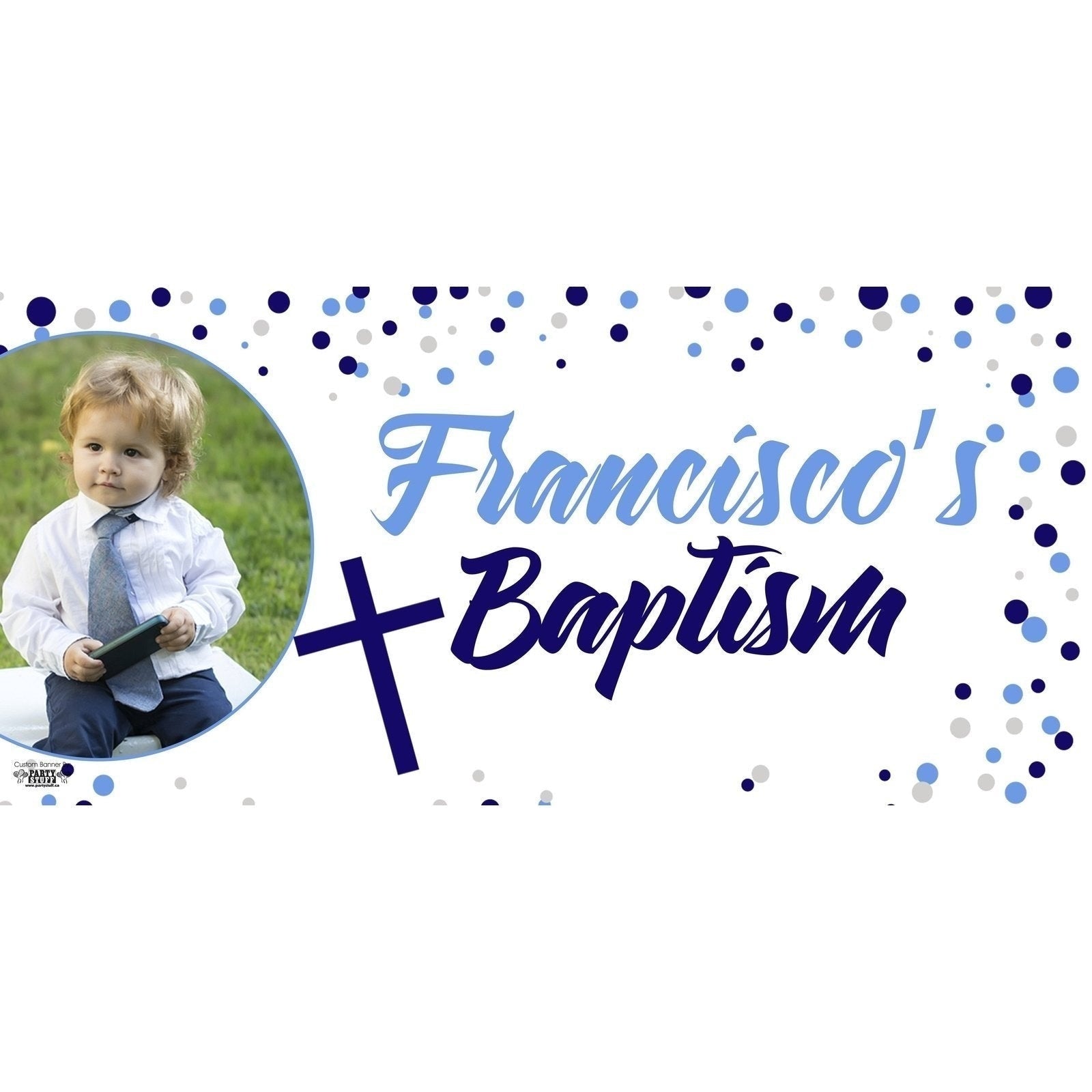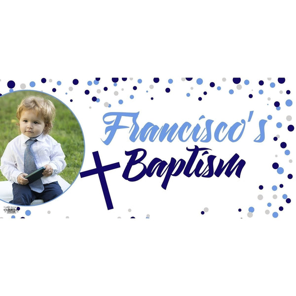 Introducing the Banner - Custom Deluxe Religious Blue & Grey Dots with Picture, a stunning addition to any celebration that beautifully commemorates your special occasion. Crafted from durable vinyl, this spacious banner measures 5' wide by 30" tall, ensuring it stands out at your event.
