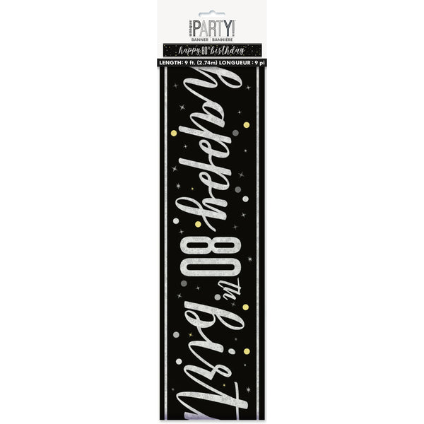 Make the 80th birthday celebration unforgettable with the Black & Silver Glitz 80th Birthday Banner. Not only does it enhance the ambiance of your event, but it also serves as a memorable keepsake for years to come. Elevate your party decor and create lasting memories with this exquisite banner that embodies the joy and grandeur of celebrating 80 wonderful years. Order yours today and step into a world of elegance and celebration!