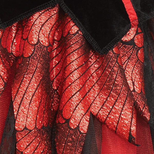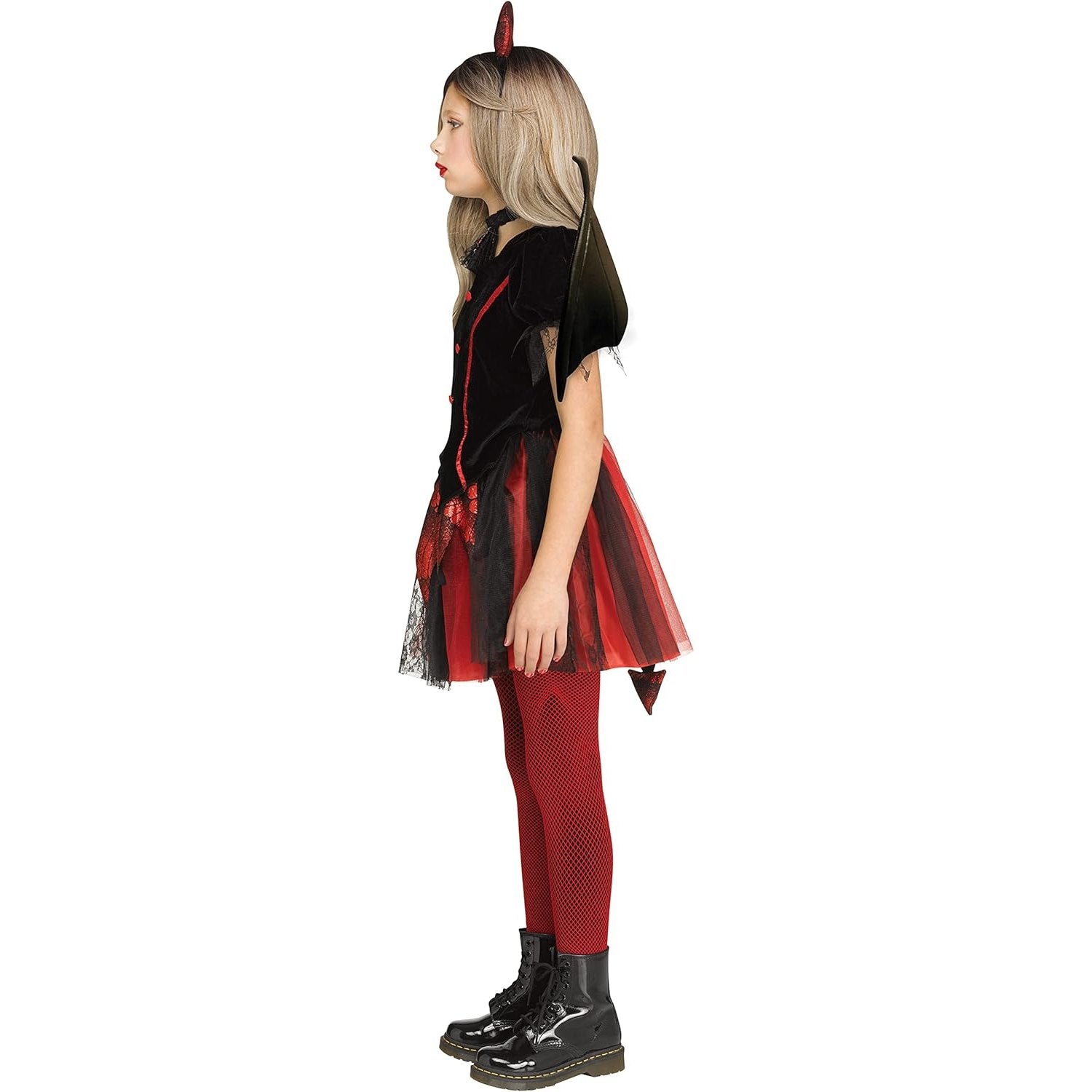 - This Devil Child costume has it all. Red shimmery accents on the horns, tail, and dress. Mesh and lace accents on the skirt of the dress and leather-look wings with wire edge to shape.