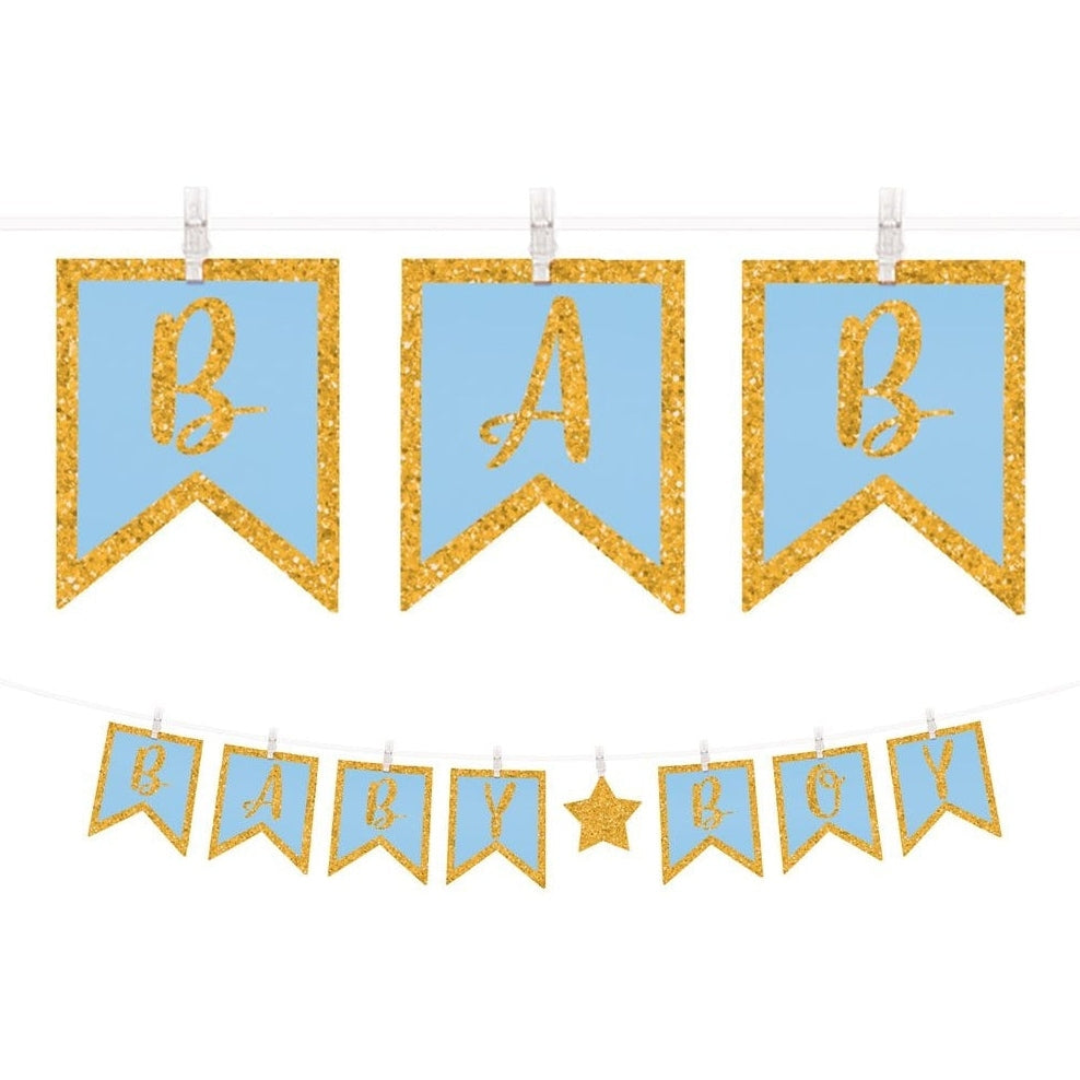 Introducing the Clothespin Letter Banner - Boy, a delightful decoration designed to elevate your little one's celebrations! Measuring an impressive 12' x 6 3/8", this banner offers ample space for custom messages that shine at birthdays, baby showers, and more.