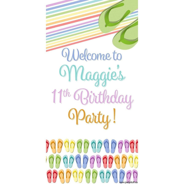 Make your celebrations unforgettable with our Customizable Deluxe Door Banner - Flip Flop Birthday. This vibrant and eye-catching banner is perfect for birthday parties, especially those with a fun beach or flip-flop theme! Crafted from high-quality, durable vinyl, this banner measures an impressive 30" wide by 58" tall, ensuring that it grabs attention and adds a festive touch to any space.