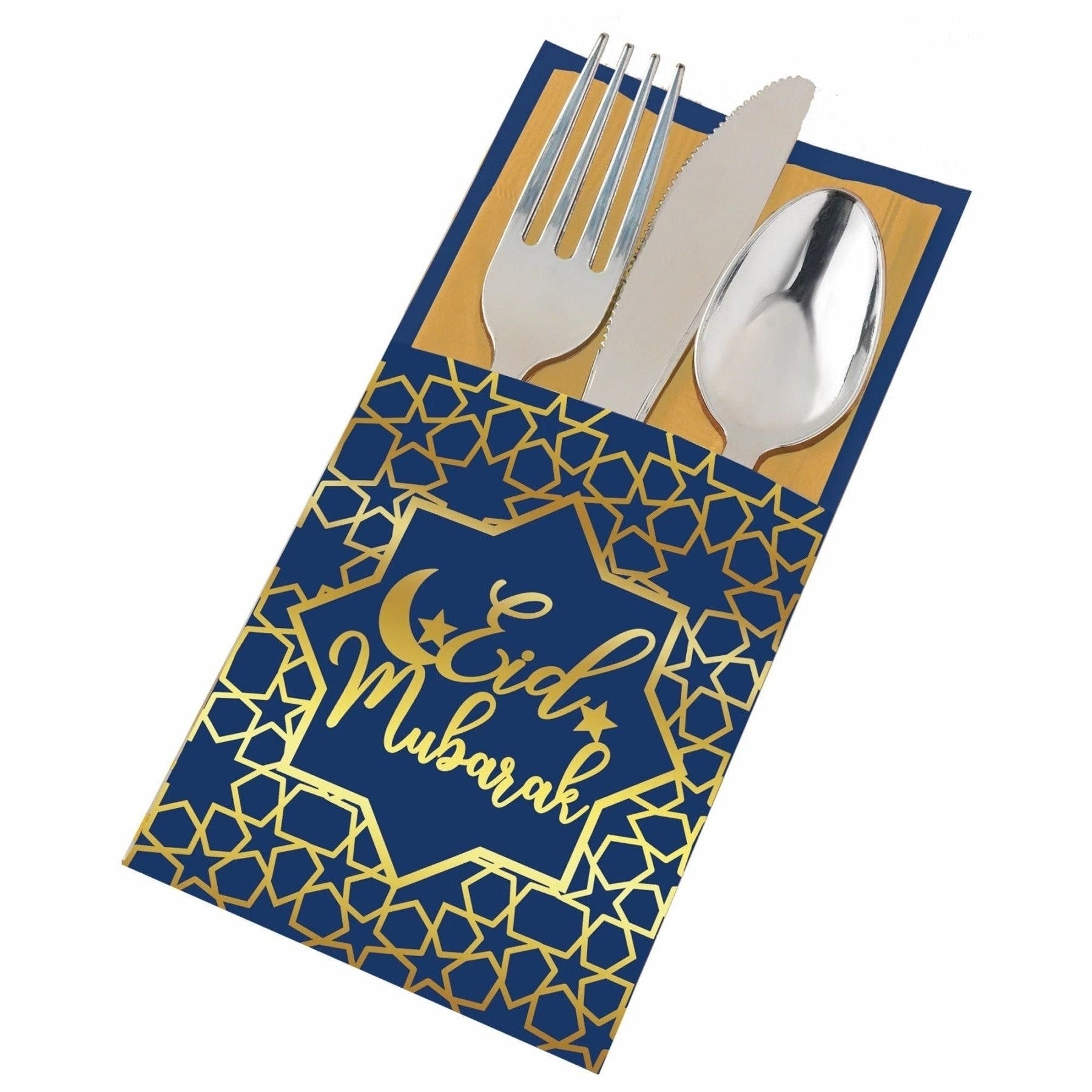 Charming Design and Size: Measuring 7 1/2" x 4 3/4", the Eid Cutlery Holder is ideal for forks, knives, and spoons, ensuring your table remains organized and stylish. Made from high-quality hot-stamped paper, these holders showcase intricate designs that enhance the festive atmosphere.