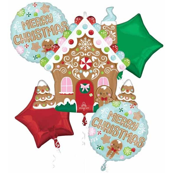 Centered on a charming gingerbread house motif, this bouquet bursts with candy-bright accents, candy canes, and playful gingerbread figures. Round foil balloons with a cheerful "Happy Holidays" message complete the look for a true seasonal showstopper.