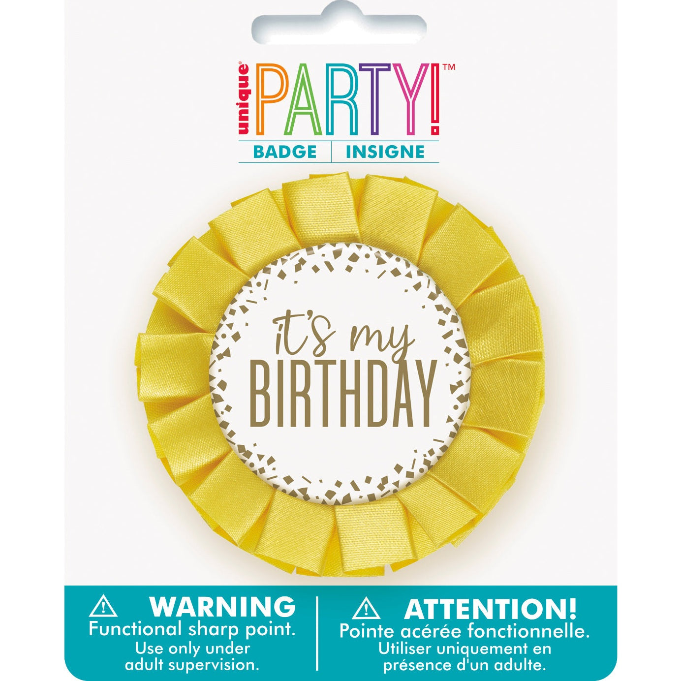 Celebrate in style with the Gold Foil Confetti "It's My Birthday" Badge. This stunning badge is designed to make you shine, adorned with eye-catching gold foil confetti that captures attention and adds glamour to your special day.