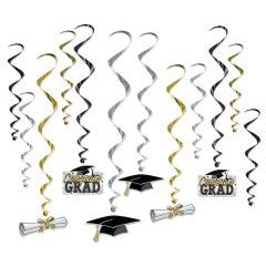 Celebrate your achievement with our Graduation Whirls, the perfect decoration to elevate any graduation party! These stunning hanging decorations feature elegant swirls in sleek black, silver, and gold tones, creating a festive atmosphere that captures the essence of this momentous occasion.