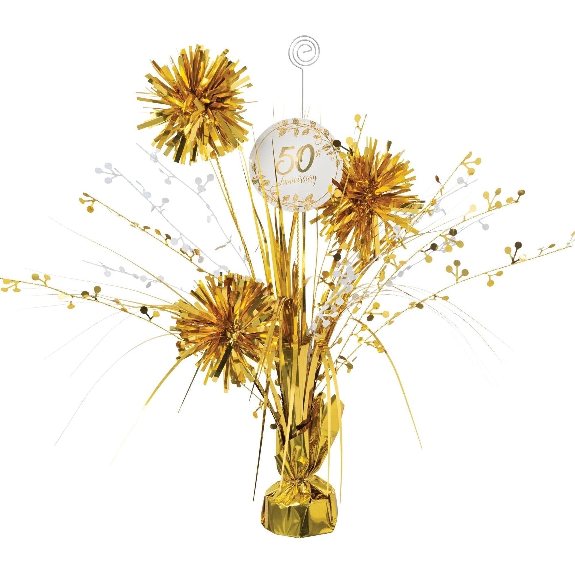 Celebrate a milestone of love with the Happy 50th Anniversary Spray Centerpiece. This stunning centerpiece stands at an impressive 18 inches, ready to elevate your golden jubilee event. It features: