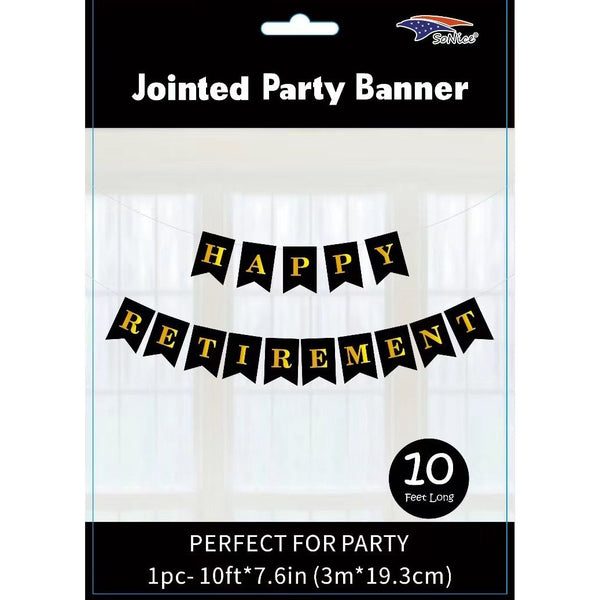 This eye-catching banner spans 10 feet, delivering standout visibility across any party space. The chic black pennants feature shimmering gold lettering that reads “HAPPY RETIREMENT,” adding a sophisticated yet joyful touch to your event. Easy to hang and ready to reuse, it’s a practical addition to your party toolbox for future celebrations.