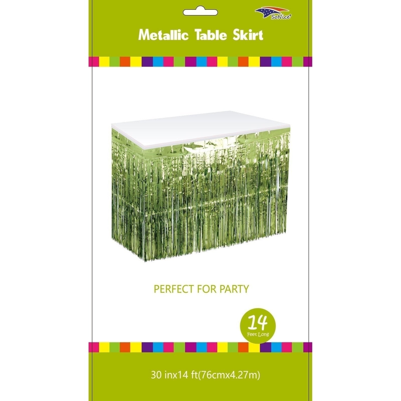 Elevate your event decor with the Lime Green Metallic Fringed Table Skirt and create unforgettable memories. Order yours today and let your tables shine like never before!