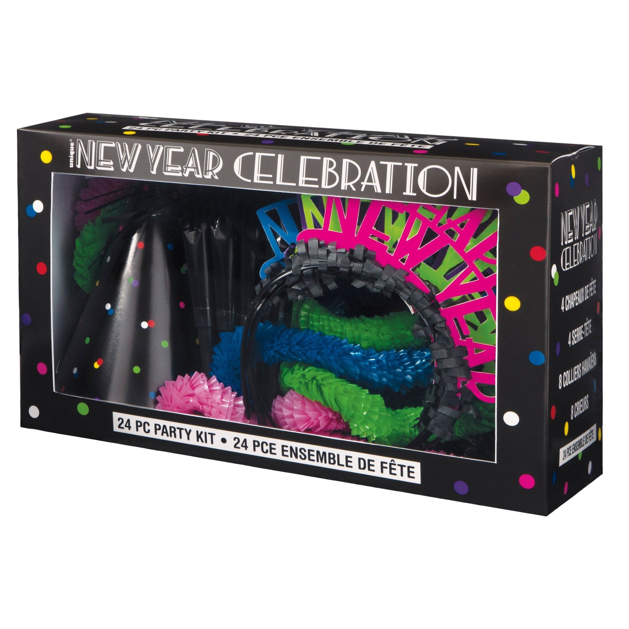 Make your New Year's Eve unforgettable with our New Years Kit - Party Hats, Boa, Headbands and Blowers, 24 Piece. Get ready to ring in the New Year with style and flair!