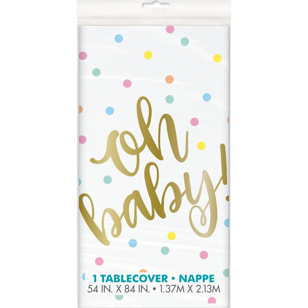 Elevate your celebration with our Table Cover - Plastic, Gold, Baby Shower, "Oh Baby", Rectangular, 54" x 84". This stunning table cover adds a touch of elegance to your baby shower, perfectly setting the scene for welcoming your little one.