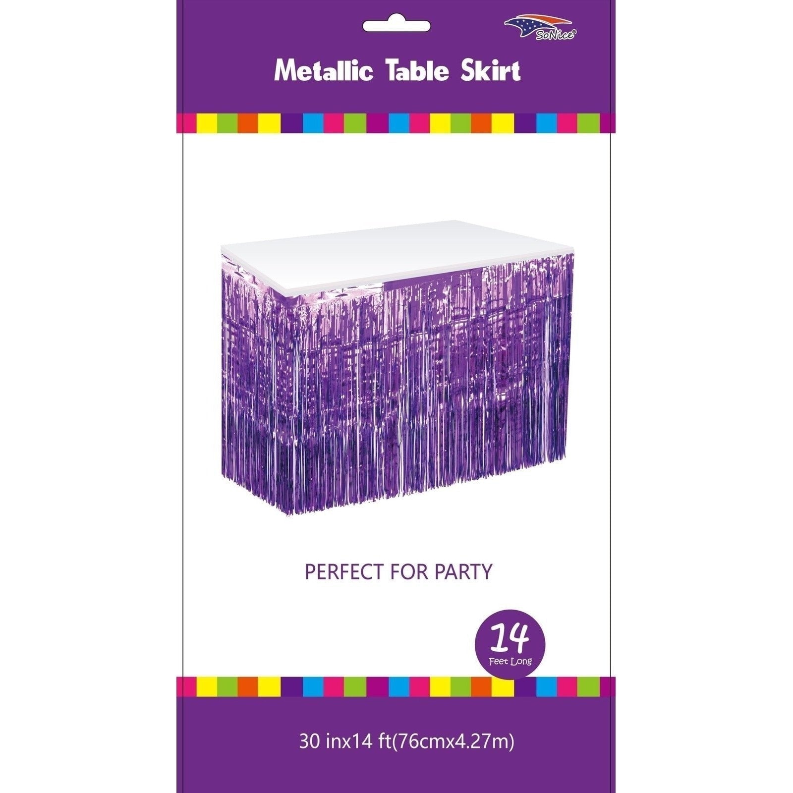 Add a touch of glamour to your decor with the Purple Metallic Fringed Table Skirt. Elevate your event and impress your guests!
