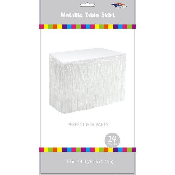 Transform your event space with our stunning White Metallic Fringed Table Skirt, designed to add a touch of elegance and flair to any occasion. Measuring 14 feet long and 30 inches high, this table skirt is perfect for dressing up banquet tables, dessert tables, or any surface that needs a decorative upgrade.